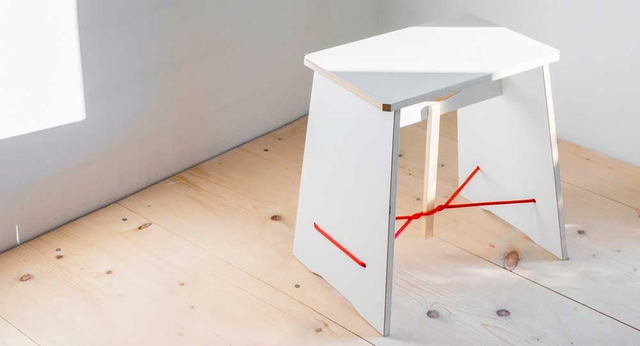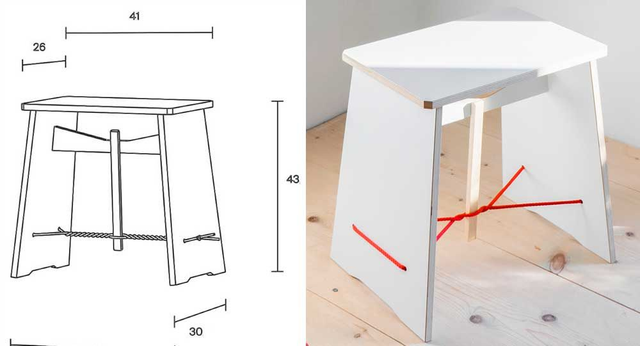 Als Verbinder der Holzkonstruktion dient ausgerechnet das flexible Seil und wird so zum statischen Element, es fixiert, positioniert und hält mit Spannung die Welt für sitzende Personen zusammen. Das Seil ist schwarz und rot zu haben, immer mit dem Knoten auf der einen Seite, die Bretter weiss oder schwarz. Als kleiner Tisch lässt sich der Stramme Max genauso nützen, stabil durch und durch wie er ist.